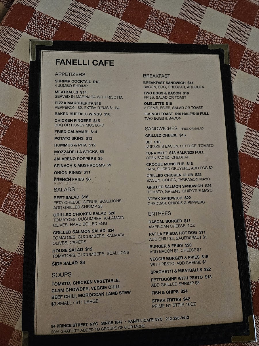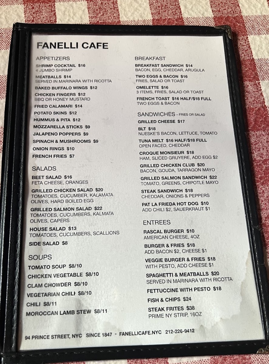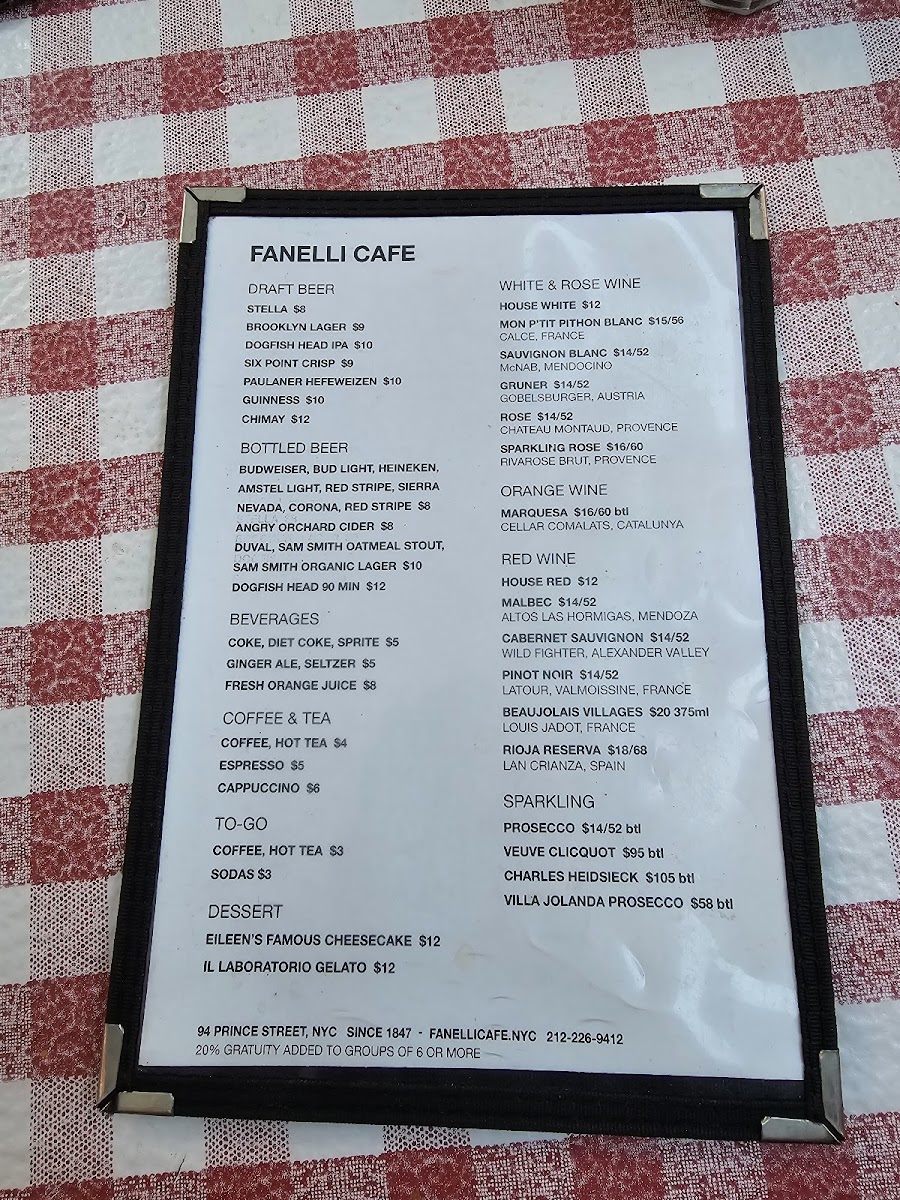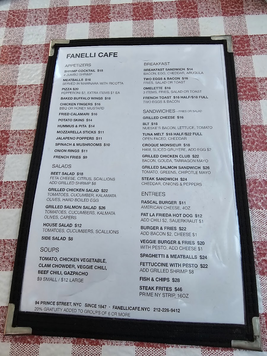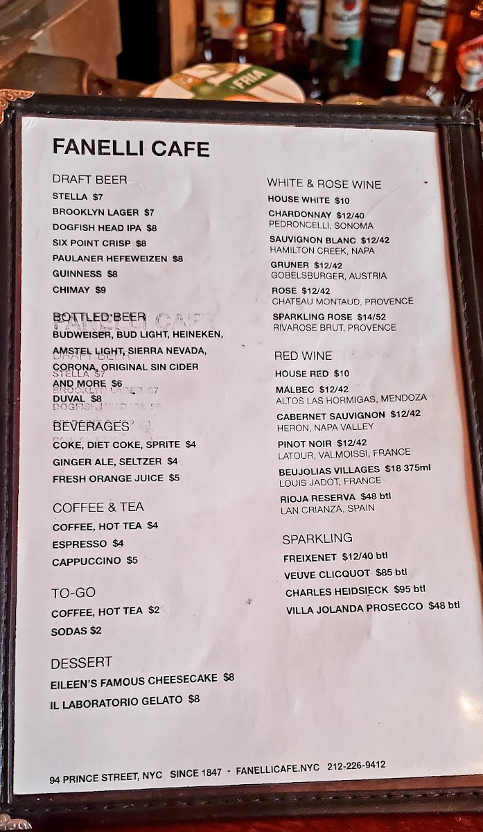 Located at 94 Prince St in the heart of Soho, Fanelli Café stands as a quintessential example of a traditional American restaurant that beautifully marries history with hearty fare. With its charming decor and storied past as a speakeasy during Prohibition, stepping into Fanelli's feels like a delightful journey through time, while also offering the vibrant energy of modern-day New York City.