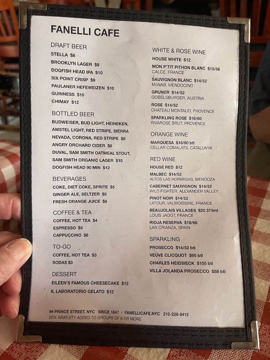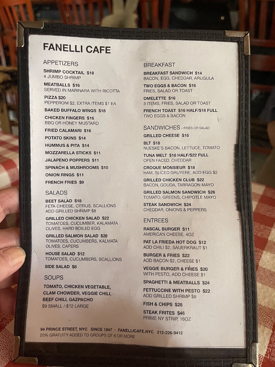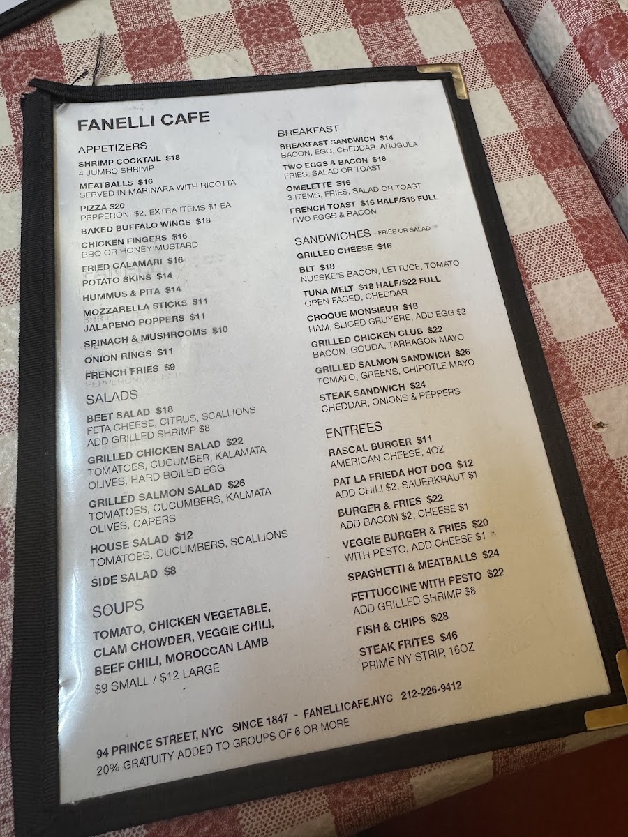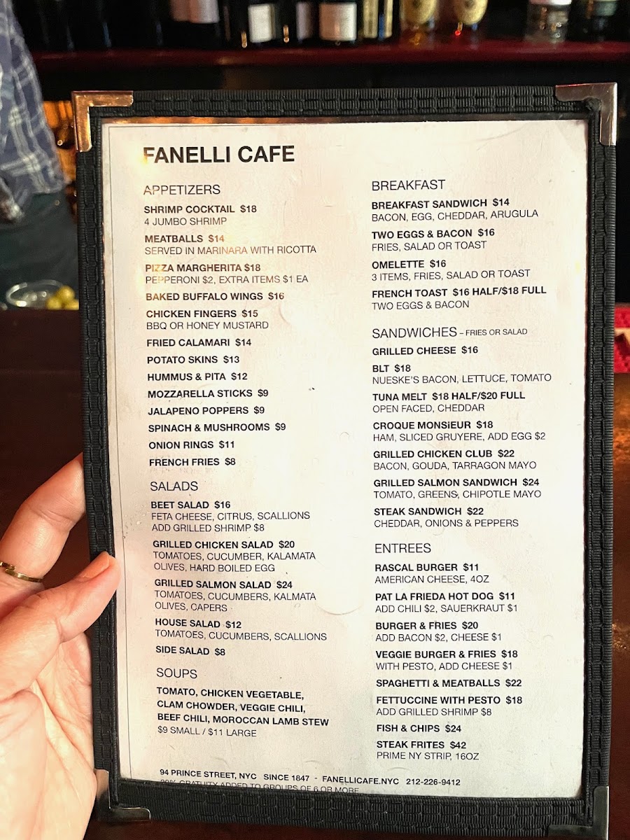 Located at 94 Prince St in the heart of Soho, Fanelli Café stands as a quintessential example of a traditional American restaurant that beautifully marries history with hearty fare. With its charming decor and storied past as a speakeasy during Prohibition, stepping into Fanelli's feels like a delightful journey through time, while also offering the vibrant energy of modern-day New York City.